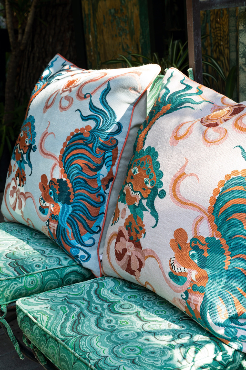Lion Dance Pink Cushion by Guo Pei flatshot Lion Dance by Guo Pei cushion insitu Lion Dance by Guo Pei cushion insitu Lion Dance by Guo Pei cushion insitu