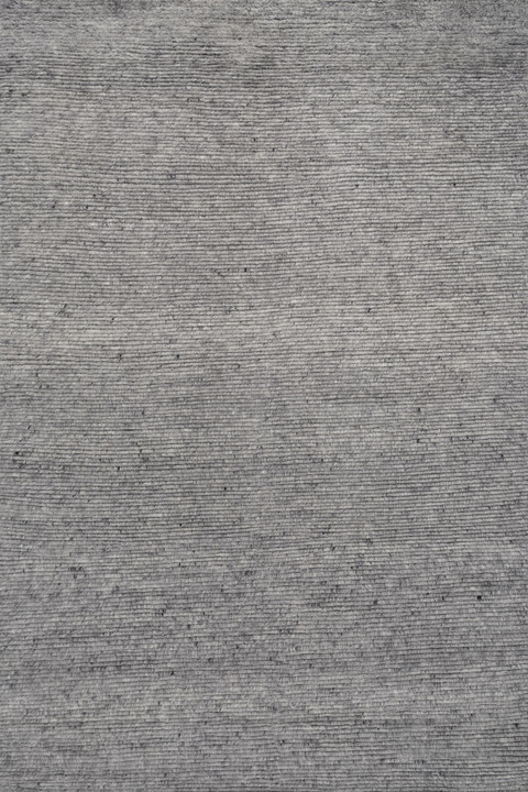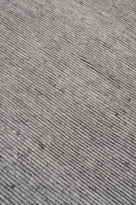 Handwoven in undyed New Zealand, The Ridge Stone Rug showcases organic variations in colour. Layering a flatwoven dark graphite base with soft rows of smoky grey cut pile, it captures the rising contours of natural landscapes with stripe-like linear ridges; alternating textures and the luxuriously shaggy pile height create sculptural softness and tactile depth.